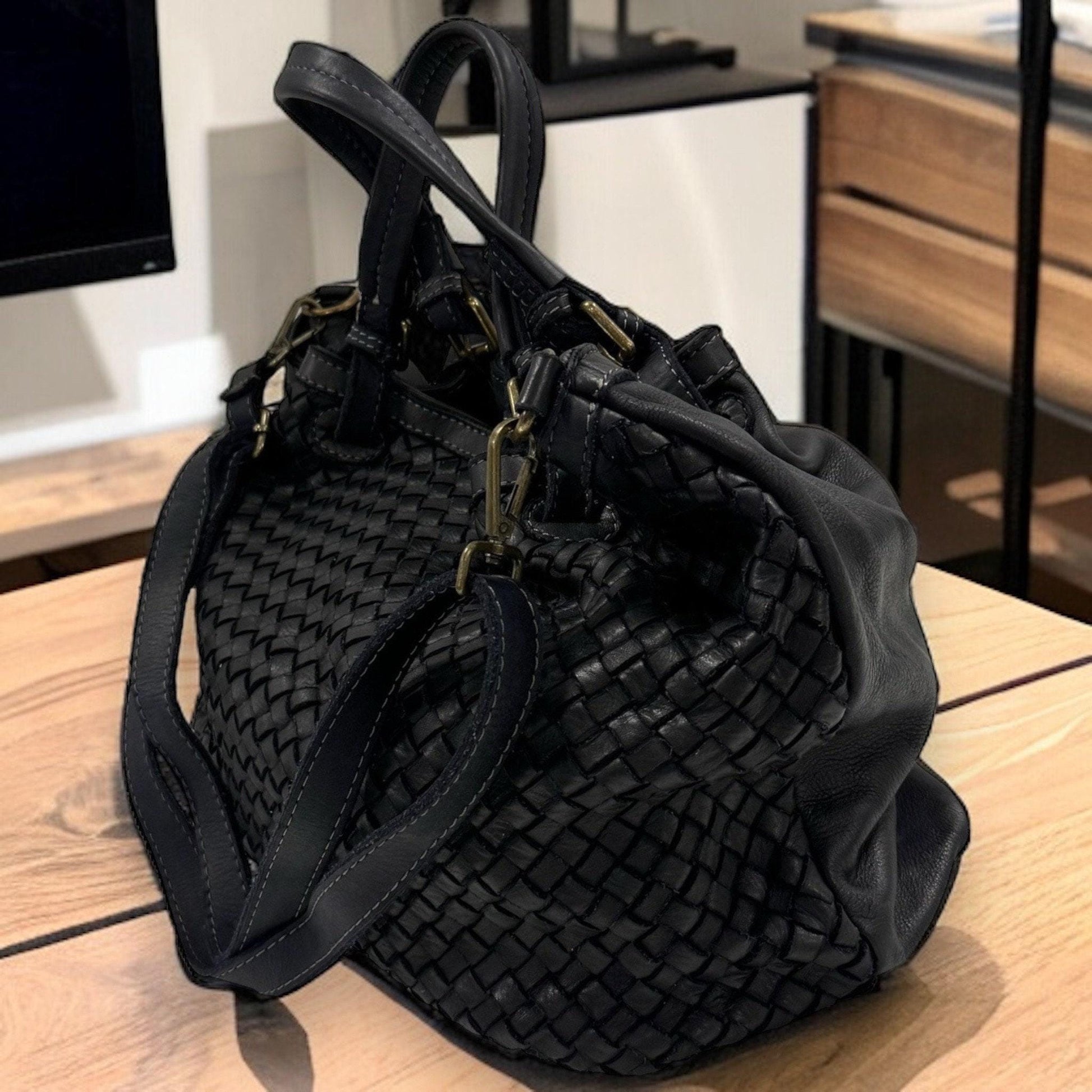 Gefertigt aus hochwertigem Premiumleder überzeugt die Tasche durch ihre weiche Haptik, feine Narbung und langlebige Qualität. Das handgeflochtene Design verleiht der Tasche einen exklusiven Look mit zeitloser Eleganz.